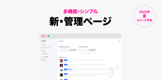 リアルイベントやライブ配信、グッズ販売ができる多機能なTIGETを、さらに直感的で使いやすくシンプルな管理ページに刷新し、販売管理や売上管理をもっと簡単にします。