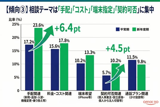 OFFICE110法人携帯では、前年4月に寄せられた社用携帯の問い合わせデータを匿名化して集計し、新年度期と平常期(2025年6月~2026年2月)の差を比較しました。