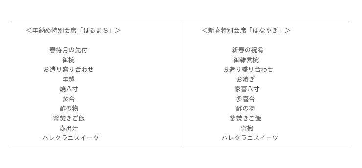 ゆく年とくる年をお祝いするにふさわしい特別な会席メニューをご用意いたしました。「はるまち」「はなやぎ」とも、選りすぐりの魚を使ったお造りや多喜合(焚き合わせ)などを盛り込んだ贅沢な会席メニューです。