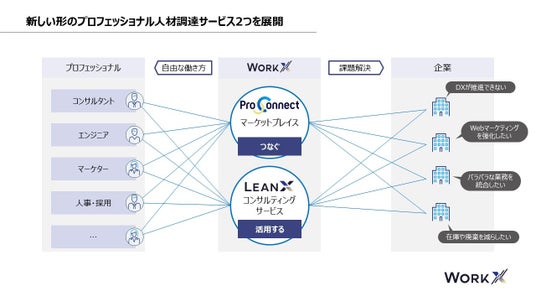 株式会社WorkX(東京都渋谷区、代表取締役:東野智晴、以下:WorkX)は、『次の100年の「働く」を作る。』をビジョンに掲げ、企業課題を解決するための新しい形のプロフェッショナル人材調達を実現する、2つのサービスを提供しています。