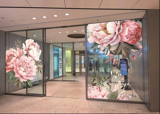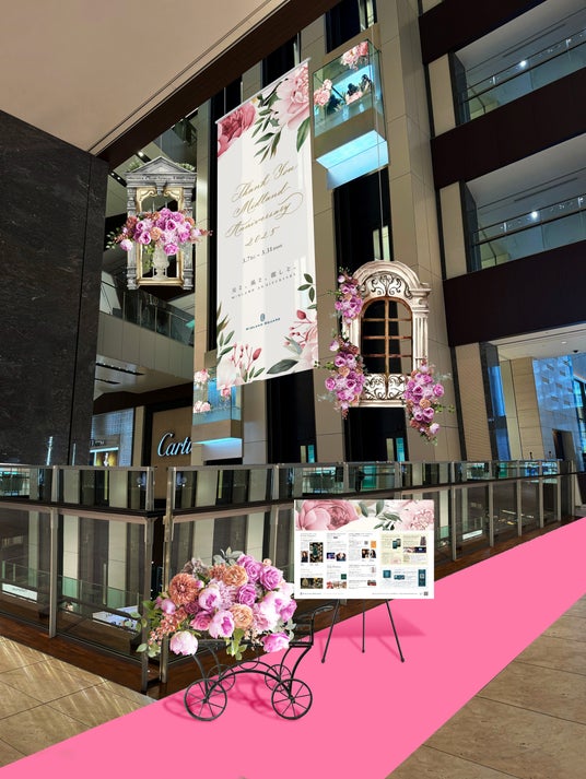 商業棟吹き抜けには、ピンクやオレンジの花で彩ったヨーロッパの建築様式を模したデコラティブな窓フレームを吊り下げ、ヨーロッパの街並みのような空間を演出。センターには、カリグラフィロゴをあしらったメインビジュアルバナーを掲げます。さらに、商業棟エレベーターにも花柄の装飾を施し、館内全体に色鮮やかな花が咲き乱れます。