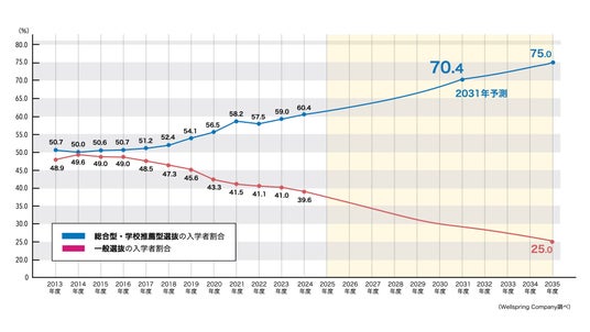 現在の大学入試において、総合型・学校推薦型選抜は年々その重要性を増しており、新中1生が受験をする2031年度の大学入試では、全体の約7割を占めると予測されています。このような動向の背景には、大学が求める学生像の変化や、社会が求める人財の多様化があります。