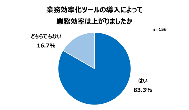 さらに、既に業務効率化ツールを導入している方へ「業務効率化ツールの導入によって、業務効率は上がりましたか」という質問をしたところ、『業務効率が上がった(はい)』(83.3%)との回答が全体の8割以上を占める結果になりました。