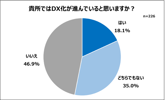 最後に、「貴所ではDX化が進んでいると思いますか?」という質問をしたところ、『進んでいる(はい)』(18.1%)、『どちらでもない』(35.0%)、『進んでいない(いいえ)』(46.9%)という結果になりました。最多となった事務所でのDX化が進んでいないと回答した人からは