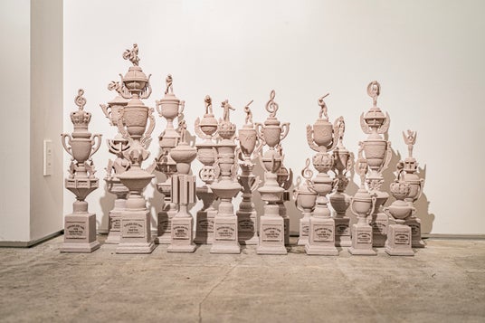 不要になった様々なトロフィーを特殊な砂でコーティングし、リデザイン