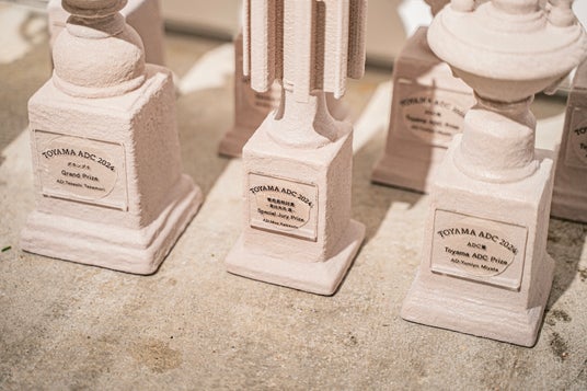 不要になった様々なトロフィーを砂でコーティングし、リデザイン についてやれ紙を使った年鑑を柱に、今年のADCを通して様々な循環に取り組んでみようと、『不要トロフィー』を使ったデザインにも挑戦しました。様々な家庭に眠っている、何十年もあるけれど捨てるに捨てられないトロフィーを集め、上から特殊な砂でコーティングしました。制作に協力してくれたのは、富山県高岡市の伝統産業工房である『高和製作所』です。普段は鋳造製品のワックス型を作っている攻防ですが、今回はその技術を転用し、トロフィーをコーティングしました。