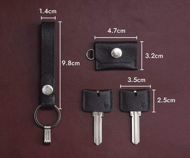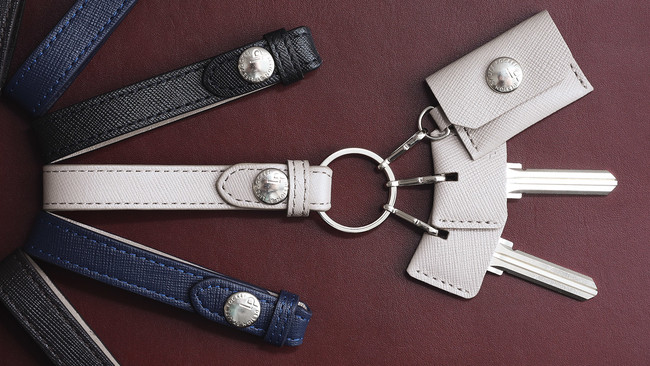 キーリングには、ストラップと同じサフィアーノレザーを使用したレザーキーキャップがセットになっております。