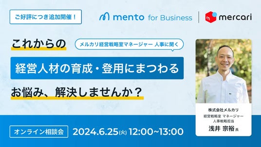 企業の管理職にマネジメントコーチ「mento for Business」を提供する株式会社mento(本社:東京都渋谷区、代表取締役:木村憲仁、以下mento)は、2024年6月25日に、株式会社メルカリ経営戦略室マネージャー人事戦略担当 浅井宗裕氏を講師に迎え、「経営人材の育成・登用」にまつわるお悩みをテーマにオンライン相談会を開催いたします。(申し込みURL:https://forbiz.mento.jp/future_seminar/OpoyPraB)