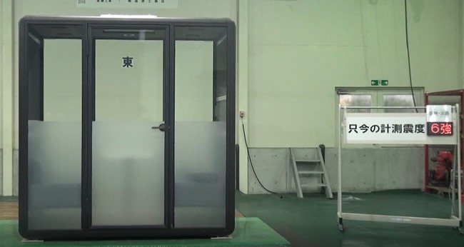 三軸起震装置を使用し、スマートワーキングブースに各種地震波形を想定した振動を加え、耐震状況を目視にて確認しました。