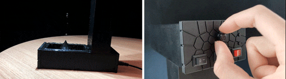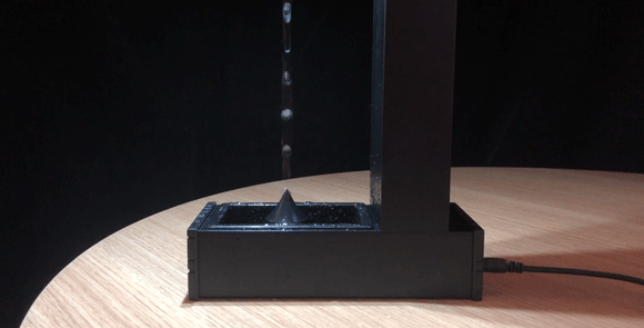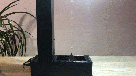 水滴が上昇していくように見えますが、実は落ちている水滴とストロボ光の組み合わせで生じた錯覚です。水滴が一定間隔で次々落ちている時に、ストロボで連続で光を当て、水滴が重力に逆らって逆流する錯覚を起こします。その目の錯覚を利用し、空間に「高級感」を演出してくれます。ふわふわと浮かび上がる水滴が目を引き、癒しの時間をお楽しみいただけます。