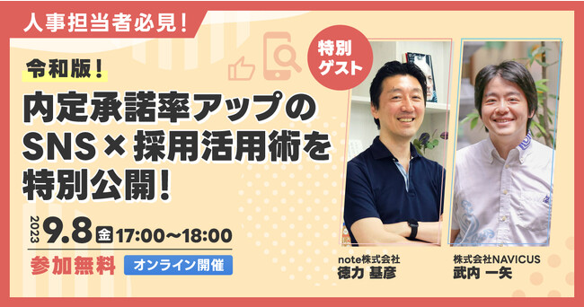 SNSを通じて企業様のコミュニケーション支援を行っている株式会社NAVICUS(本社:東京都千代田区、代表 武内 一矢、以下NAVICUS)はこのたび、人事担当者・採用に関わる方を対象に、無料のセミナー「人事担当者必見!令和版!内定承諾率アップのSNS×採用活用術を特別公開!」を2023年9月8日(金)に開催いたします。