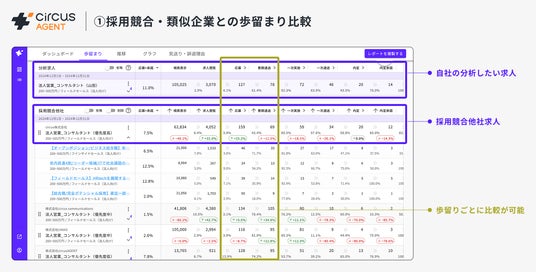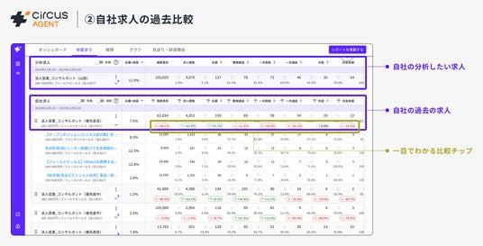 「他社採用データ閲覧機能」は、人材紹介プラットフォーム「circusAGENT」に搭載された新しい機能です。これまでは採用企業が閲覧することが難しかった「採用競合や類似企業の採用データ」を開示し、自社の採用データと比較・分析することが可能となり、より効果的な採用戦略の立案をサポートします。