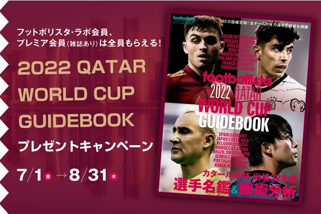 2022年7月1日(金)~2022年8月31日(水)の間、フットボリスタのサブスクに会員登録いただくと「footballista 2022 QATAR WORLD CUP GUIDEBOOK」をプレゼント!是非、この機会にサブスクへの会員登録をご検討ください。