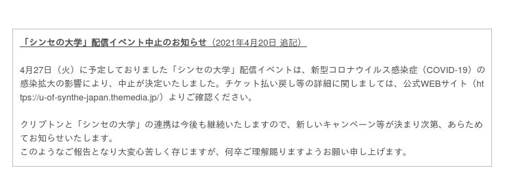 クリプトンは今後も継続して「シンセの大学」と連携し、人気ソフト音源のプレゼント企画等を通してクリエイターを応援して参ります。今後の展開にどうぞご期待ください。