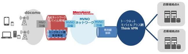 トークネットは同社の「Think VPN」のオプションサービスとして、au回線を利用した閉域モバイル接続サービス「モバイルプラス」を提供しておりましたが、昨今のテレワーク等の普及により、中継区間をより広帯域にしたサービスの提供が必須となっており、当社の運用する MVNO コアネットワークと1Gb/sのベストエフォート帯域で接続することで、ドコモ回線を利用した「モバイルプラス(CMA)」の提供を実現いたしました。