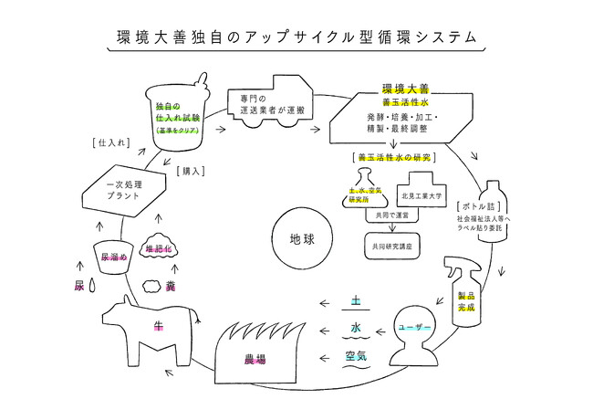 環境大善は、原料である牛の尿をアップサイクルさせ商品として生まれ変わらせています。原料自体に着目したサーキュラーエコノミーの推進だけではなく、商品開発においても環境や社会に配慮した取り組みを進めています。
