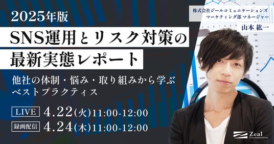 株式会社ジールコミュニケーションズ(本社:東京都渋谷区、代表:薮崎 真哉)は、2025年4月22日(火)/24日(木)の2日間におきまして「【2025年版】SNS運用とリスク対策の最新実態レポート― 他社の体制・悩み・取り組みから学ぶベストプラクティス」と題したオンラインセミナーを開催いたします。