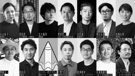 (上段・左から)永山祐子(永山祐子建築設計|建築家)、窪田 茂(Degins JP|建築家、日本商環境デザイン協会理事長)、五十嵐 淳(五十嵐淳建築設計事務所|建築家)、黒田哲二(UDS|UDS 代表取締役社長)、谷尻 誠(SUPPOSE DESIGN OFFICE|建築家)、徳山弘基(アクシス|『AXIS』編集長)、成瀬友梨(成瀬・猪熊建築設計事務所|建築家)、(下段・左から)齊藤太一(DAISHIZEN|造園家)、西田 司(オンデザイン|建築家)、ロンロ・ボナペティ(アラウンドアーキテクチャー パートナー|建築ライター・編集者)、大野 力(sinato|建築家)、西澤明洋(エイトブランディングデザイン|ブランディングデザイナー)、佐渡島庸平(コルク|編集者)、山下正太郎(コクヨ|ヨコク研究所所長、ワークスタイル研究所所長) ※順不同