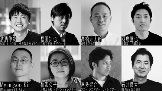 (上段・左から)濱渦伸次(NOT A HOTEL|同社代表取締役 CEO)、松田知也(乃村工藝社)、高橋寿太郎(創造系不動産)、羽鳥達也(日建設計|建築家、同社設計監理部設計部長)、(下段・左から)Myungsoo Kim(『Magazine B』CEO、Bメディアカンパニー代表取締役兼クリエイティブディレクター)、柏瀬久子(乃村工藝社|デザインディレクター)、喜多健介(ソニー・ホンダモビリティ|シニアアートディレクター)、石井良太(BEAMS|同社設計部長) ※順不同