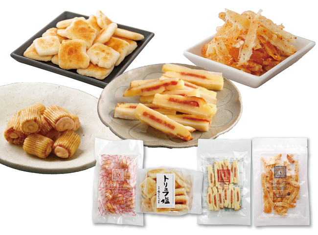 チーズめんたいおかきミニ、トリュフ塩、焼きチーズサラミ小、柚子七味えいひれ