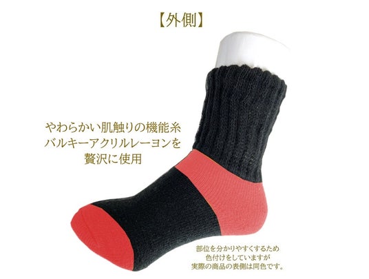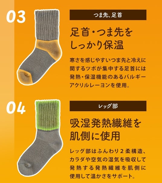 寒さを感じやすい【つま先】と、冷えに関するツボが多い【足首】部分には吸湿発熱糸バルキーアクリルレーヨンを使用