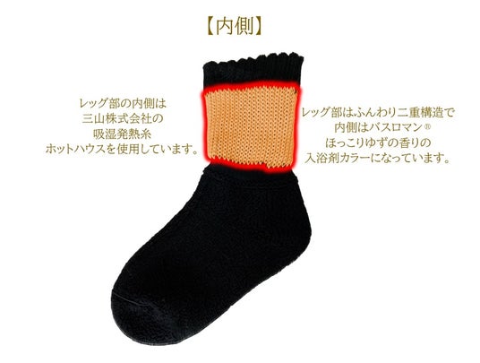 ●足首・つま先をしっかり保温 ●レッグ部吸湿発熱繊維(ホットハウスW(R))を肌側に使用