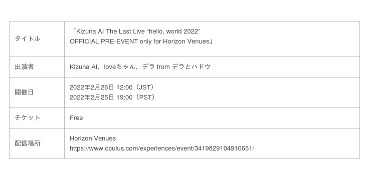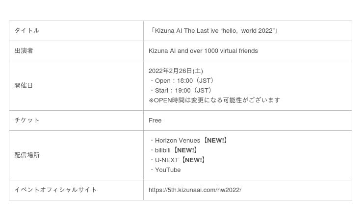 【Kizuna AI The Last Live “hello, world 2022”】https://5th.kizunaai.com/hw2022/