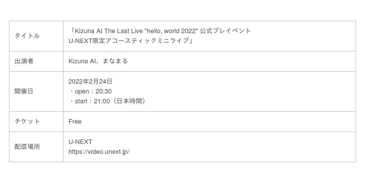「Kizuna AI The Last Live "hello, world 2022" 公式プレイベントU-NEXT限定アコースティックミニライブ」
