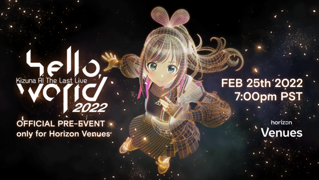 2022年2月26日(土)に開催される無料ライブ「Kizuna AI The Last Live “hello,world 2022”」が、すでに発表済みのYou Tubeに加えて、Horizon Venues、bilibili、U-NEXTにて無料配信することが決定しました。さらに各プラットフォームではライブ配信を記念して、それぞれ独自のプレイベントも開催致します。