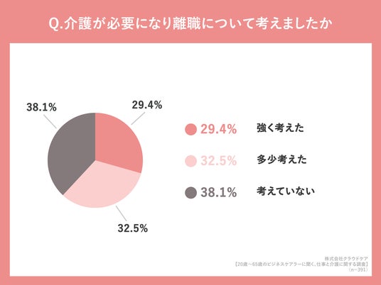 「介護が必要になり離職について考えましたか」(n=391人、単一回答)と質問したところ「強く考えた」が29.4%、「多少考えた」が32.5%という回答になりました。