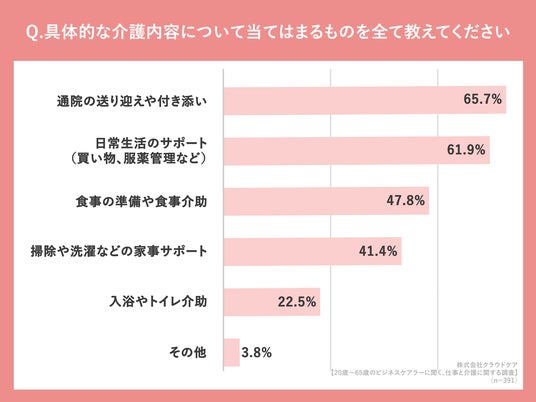 「具体的な介護内容について当てはまるものを全て教えてください」(n=391人、複数回答)と質問したところ「通院の送り迎えや付き添い」が65.7%と最も多くなりました。