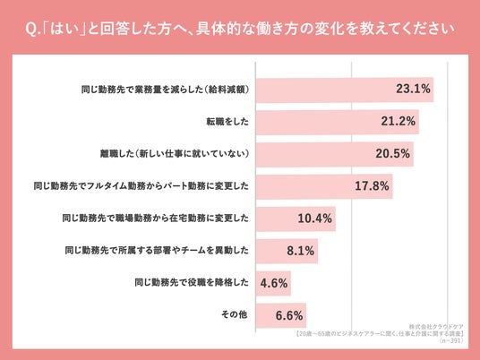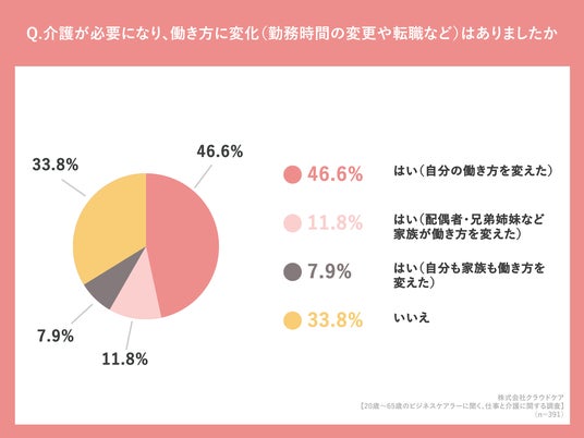 「介護が必要になり、働き方に変化(勤務時間の変更や転職など)はありましたか」(n=391人、単一回答)と質問したところ「はい(自分の働き方を変えた)」が46.6%、「はい(配偶者・兄弟姉妹など家族が働き方を変えた)」が11.8%、「はい(自分も家族も働き方を変えた)」が7.9%という回答になりました。