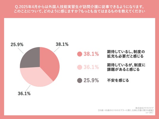「介護サービスを支える人材不足が課題とされる中、2025年4月からは外国人技能実習生が訪問介護に従事できるようになります。このことについて、どのように感じますか?最も当てはまるものを教えてください」(n=391人、単一回答)と質問したところ「期待しているし、制度の拡充も必要だと感じる」が38.1%、「期待しているが、制度に課題があると感じる」が36.1%という回答になりました。