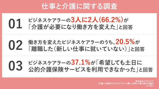 ネットで簡単に頼める訪問介護・家事・生活支援サービス「Crowd Care(クラウドケア)」を運営する株式会社クラウドケア(本社:東京都渋谷区、代表取締役CEO:小嶋潤一)は、20歳~65歳の仕事をしながら介護をした経験を持つビジネスケアラー391名を対象に、仕事と介護に関する調査を実施いたしましたので報告いたします。