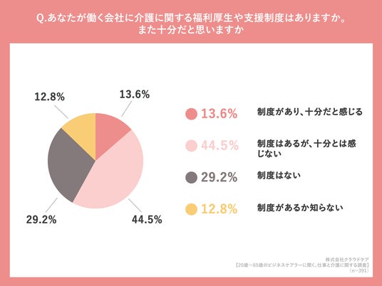 「あなたが働く会社に介護に関する福利厚生や支援制度はありますか。また十分だと思いますか」(n=391人、単一回答)と質問したところ「制度はあるが、十分とは感じない」が44.5%と最も多くなりました。