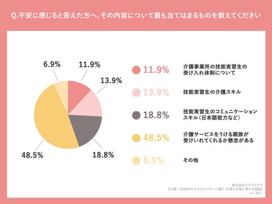 「不安に感じると答えた方へ、その内容について最も当てはまるものを教えてください」(n=101人、単一回答)と質問したところ「介護サービスをうける親族が受けいれてくれるか懸念がある」が48.5%という回答になりました。