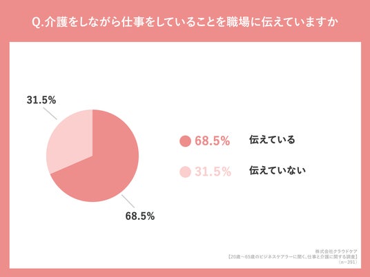 「介護をしながら仕事をしていることを職場に伝えていますか」(n=391人、単一回答)と質問したところ「伝えている」が68.5%という回答になりました。