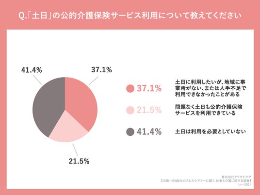 「「土日」の公的介護保険サービス利用について教えてください」(n=391人、単一回答)と質問したところ「土日に利用したいが、地域に事業所がなく、または人手不足で利用できなかったことがある」が37.1%という回答になりました。