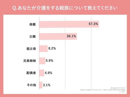 「あなたが介護をする親族について教えてください」(n=391人、複数回答)と質問したところ「母親」が57.3%、「父親」が36.1%という回答になりましました。