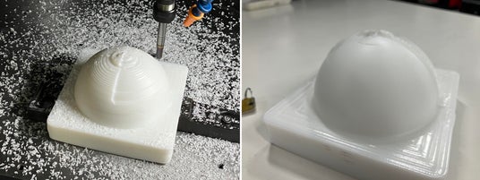現在開発中の切削ユニットを利用したときのイメージサンプルです。3Dプリント後に切削加工することで、積層痕を滑らかにし、寸法精度が必要な穴あけなどが可能。