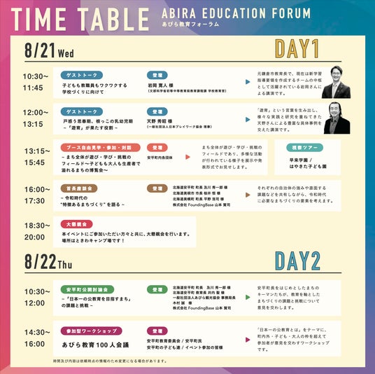 株式会社FoundingBase(本社:東京都世田谷区、代表:山本 賢司)は、「あびら教育フォーラム」を2024年8月21日(水)~8月22日(木)に安平町立早来学園にて開催します。