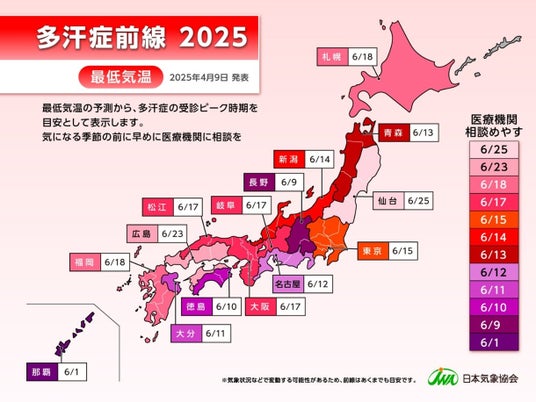 今回発表された「多汗症前線2025」は、科研製薬・日本気象協会・JMDCの3社と長崎大学が協力し、多汗症患者の受診(レセプト情報)と気象の2つのビッグデータを集積・分析することで、受診のピークを予測した「多汗症前線」を2025年の春から夏にかけての最新の気象予報をもとに作成したものです。