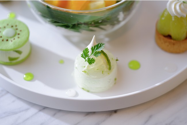プリン・ア・ラ・モードは、新鮮な卵をたっぷり使った濃厚な味わいのプリンに、夏を感じるマンゴーやパイン、口どけの良いシャンティ、バニラアイスでデコレーション。どこか懐かしい味のプリンとフルーツの爽やかな酸味のハーモニーをお楽しみいただけます。シャインマスカットタルトはサクッとした生地に旬のみずみずしいマスカットを贅沢にトッピング。ライムレアチーズケーキは、爽やかなライムの香りをアクセントに、スッキリとした甘さに仕上げています。キウイアイスサンドクッキーは、キウイに見立てたクッキーにクリームチーズを使用したキウイアイスをサンドしました。暑い夏の昼下がり、爽やかなビタミンカラーのケーキセットで素敵なひとときをお楽しみください。