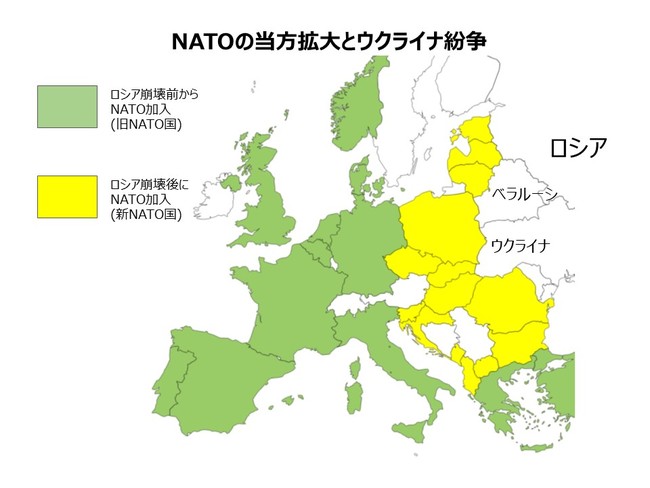 ベルリンの壁崩壊以降、1949年にソ連対抗のために締結された欧州と北米の集団安全保障条約であるNATO(北大西洋条約)は、1991年のソ連崩壊後、1999年のチェコ、ハンガリー、ポーランドの加盟が端緒となり、旧東欧諸国が相次で加盟した。現在では加盟国数30(2020年)に上る。NATOは、「集団防衛」、「危機管理」及び「協調的安全保障」の三つを中核的任務とした軍事同盟が基本であり、ロシアから見れば、自分たちに突き付けられた「西側諸国の槍」に見えなくもありません。