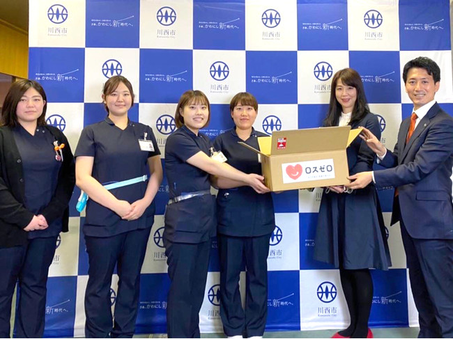 (右より、越田謙治郎川西市長、ロスゼロ代表・文美月、医療従事者のみなさん)