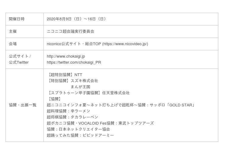 「ニコニコネット超会議2020夏 Supported by NTT」開催概要