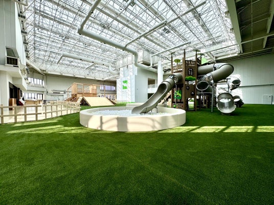 天井高約10m、施設面積約600坪に人口芝を敷き詰め、大型遊具に知育玩具、木製玩具、オリジナル玩具、キッチンコーナー、アスレチックエリア、等がたくさん取り揃えられています。こどもたちは天候や環境を気にすることなく、遊ぶことができ、子育て世代の方たちも安心しながら遊びを見守っていただけます。