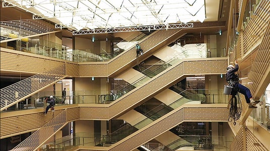 ダイケンは、工場・倉庫の出入口にある、重くて大きい扉を吊り下げて移動するためのレール部品「ハンガーレール」のトップメーカーです。この「ハンガーレール」のノウハウを応用し、ビルメンテナンス向けに「墜落防止装置:セフティーレールシステム メンテナンスレール」を開発しました。本製品は、作業者の安全を確保しつつ作業効率向上につなげます。既に国内の主要都市の商業施設を中心に採用実績を伸ばしています。※本製品は新築工事や改修工事時に施工。