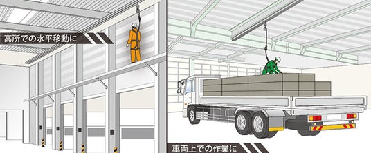 高所での作業者の安全な吊り下げと移動を実現し作業効率向上につなげるレールシステムを展示!