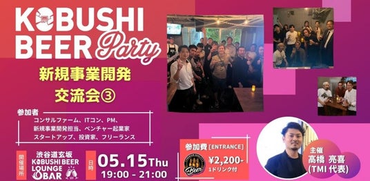 KOBUSHI MARKETING合同会社(東京都渋谷区、代表:井上裕介)が運営する渋谷道玄坂の『KOBUSHI BEER LOUNGE & BAR』では、人と人とを繋ぐユニークな取り組みを行い多くのビジネスチャンスを生み出している。そして今回、TMI株式会社との共同主催で、2025年5月15日(木)19:00~新規事業開発やクライアントワークに関する情報交換などが行える交流イベントを開催すると発表した。